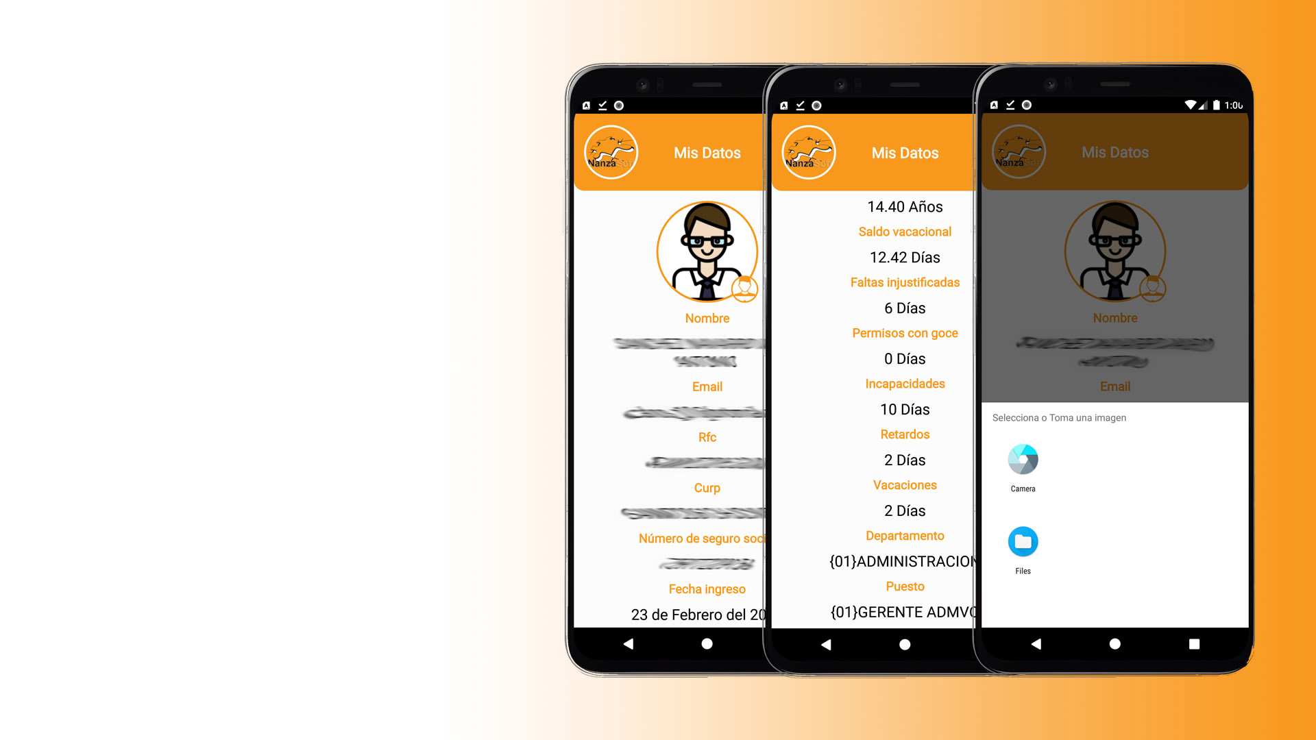 Aplicación movil con la cual los empleados pueden ver su información general, nóminas timbradas, calendario de dias inhábiles, faltas, incapacidades, retardos, permisos con goce y vacaciones. También pueden generar solicitudes de vacaciones y justificaciones de retardos y faltas.